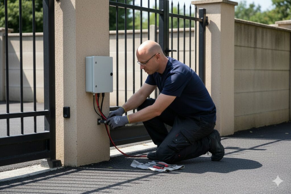 - Mise en place de la motorisation (bras pour portails battants, rail pour portails coulissants).